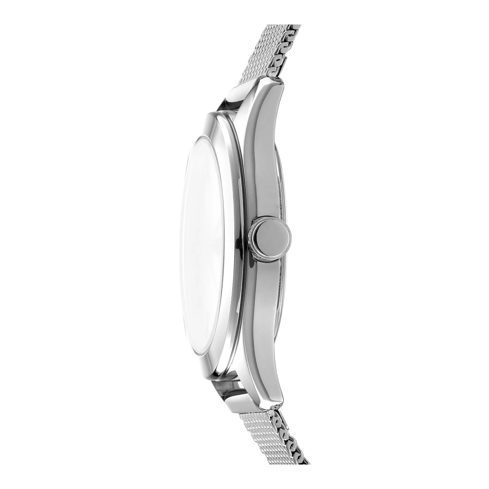 Im pulsierenden Herzen von New York City, wo Mode auf Funktion trifft, entsteht eine Uhr, die den Geist moderner Eleganz verkörpert – die DKNY DK1L032 Astoria Logo Uhr. Mit Präzision und einem geschulten Auge für Stil gefertigt, ist diese Uhr ein Zeugnis des raffinierten Designs, für das DKNY bekannt ist. Ihr rundes Gehäuse, getaucht in einen eleganten silbergrauen Farbton, misst einen anmutigen Durchmesser von 34 mm und ist das perfekte Accessoire für die zeitgenössische Frau, die sowohl Form als auch Funktion schätzt. Das Mineralglas bietet einen klaren Blick auf das Zifferblatt, das den silbergrauen Ton des Gehäuses widerspiegelt und eine nahtlose und schicke Ästhetik schafft. Das Edelstahlarmband, ebenfalls in Silbergrau, umschließt das Handgelenk mit einem verstellbaren Schiebverschluss und sorgt für eine perfekte Passform bei jeder Gelegenheit. Mit einer Wasserdichtigkeit von bis zu 50 Metern ist diese Uhr ebenso praktisch wie stilvoll und begleitet Sie vom Geschäftstreffen bis zum Wochenendausflug. Das Quarzwerk sorgt für präzise Zeitmessung, während die Drei-Zeiger-Anzeige dieser modernen Wunderuhr einen klassischen Touch verleiht. Die DKNY Astoria Logo Uhr ist mehr als nur eine Uhr, sie ist ein Statement von Raffinesse und eine Hommage an die lebendige Energie der Stadt, die niemals schläft.