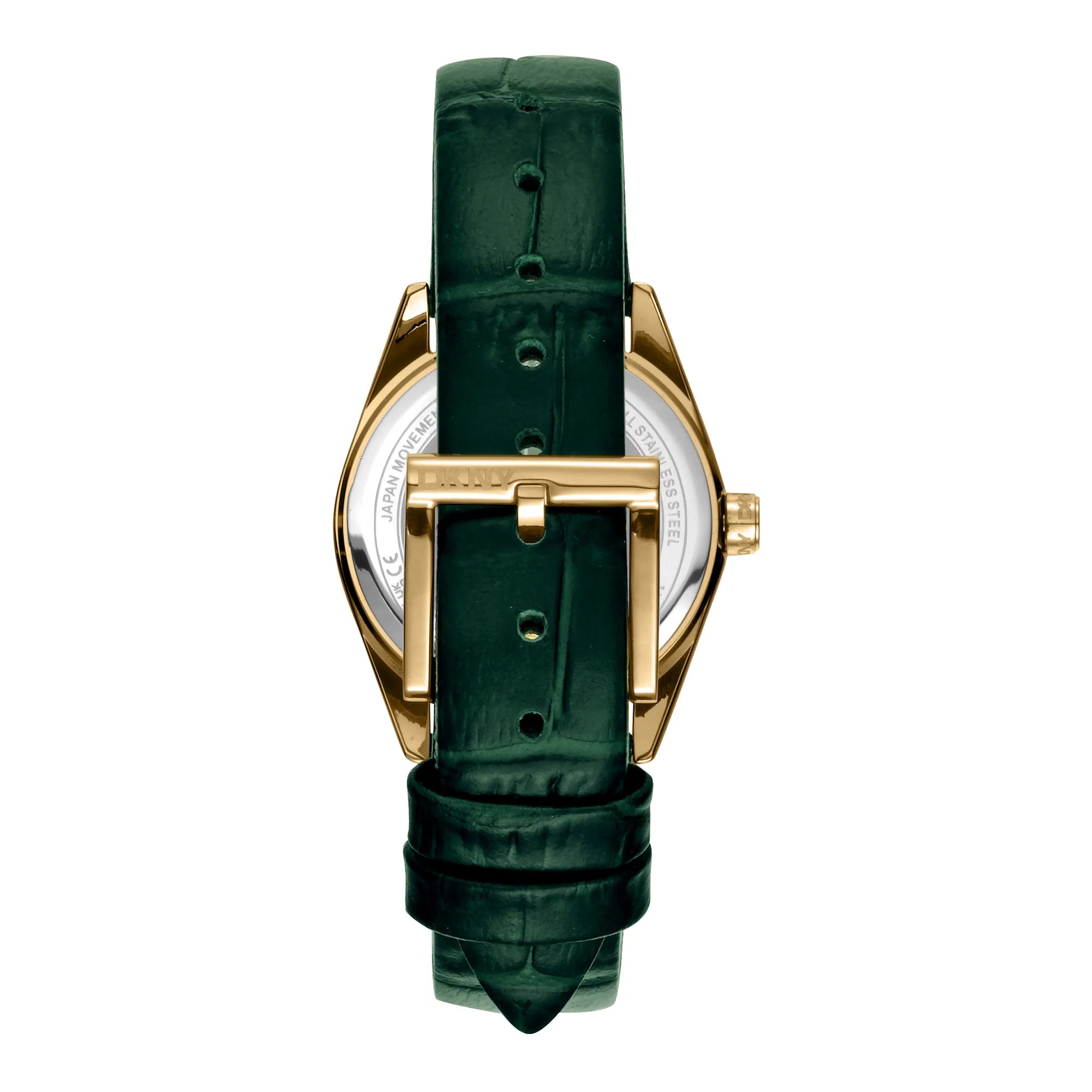 Im Herzen urbaner Eleganz erscheint die DKNY Nolita Midi Uhr als ein Leuchtturm des anspruchsvollen Stils. Mit einem raffinierten Design gefertigt, fängt diese Uhr das Wesen moderner Mode mit ihrem runden Gehäuse aus Gelbgold ein, das mit einer subtilen, aber auffälligen Anziehungskraft glänzt. Mit einem zarten Durchmesser von 32 mm sitzt sie anmutig am Handgelenk und ist das perfekte Accessoire für die zeitgenössische Frau, die sowohl Form als auch Funktion schätzt. Das flaschengrüne Lederarmband, gesichert mit einer klassischen Dornschließe, verleiht einen Hauch von von der Natur inspirierter Eleganz und bildet einen schönen Kontrast zum silbergrauen Zifferblatt. Diese harmonische Farbkombination ruft ein Gefühl zeitloser Schicklichkeit hervor, während das Mineralglas Haltbarkeit und Klarheit gewährleistet. Mit einer Wasserdichtigkeit von bis zu 50 Metern ist diese Uhr ebenso praktisch wie stilvoll und bereit, Sie durch die Abenteuer des Lebens zu begleiten. Das Quarzwerk garantiert Präzision, während die Drei-Zeiger-Anzeige einen klaren und aufgeräumten Look bietet. Die DKNY Nolita Midi Uhr ist nicht nur eine Uhr, sondern ein Statement für modebewusstes Denken, perfekt für diejenigen, die die schönen Dinge im Leben zu schätzen wissen.