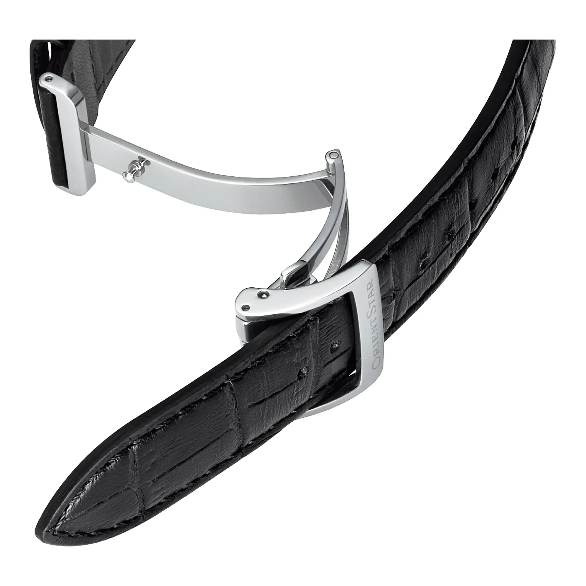 Eine Hommage an zurückhaltenden Luxus, verbindet diese klassische Herrenuhr ein silbergraues 41-mm-Gehäuse mit einem tiefblauen Zifferblatt, das alles durch Saphirglas geschützt wird. Der transparente Boden gibt einen Hinweis auf die Kunstfertigkeit im Inneren, während ein weiches schwarzes Lederarmband und eine Faltschließe für eine maßgeschneiderte Passform sorgen. Die Wasserdichtigkeit bis 100 Meter stellt sicher, dass diese Uhr ebenso praktisch wie elegant ist.