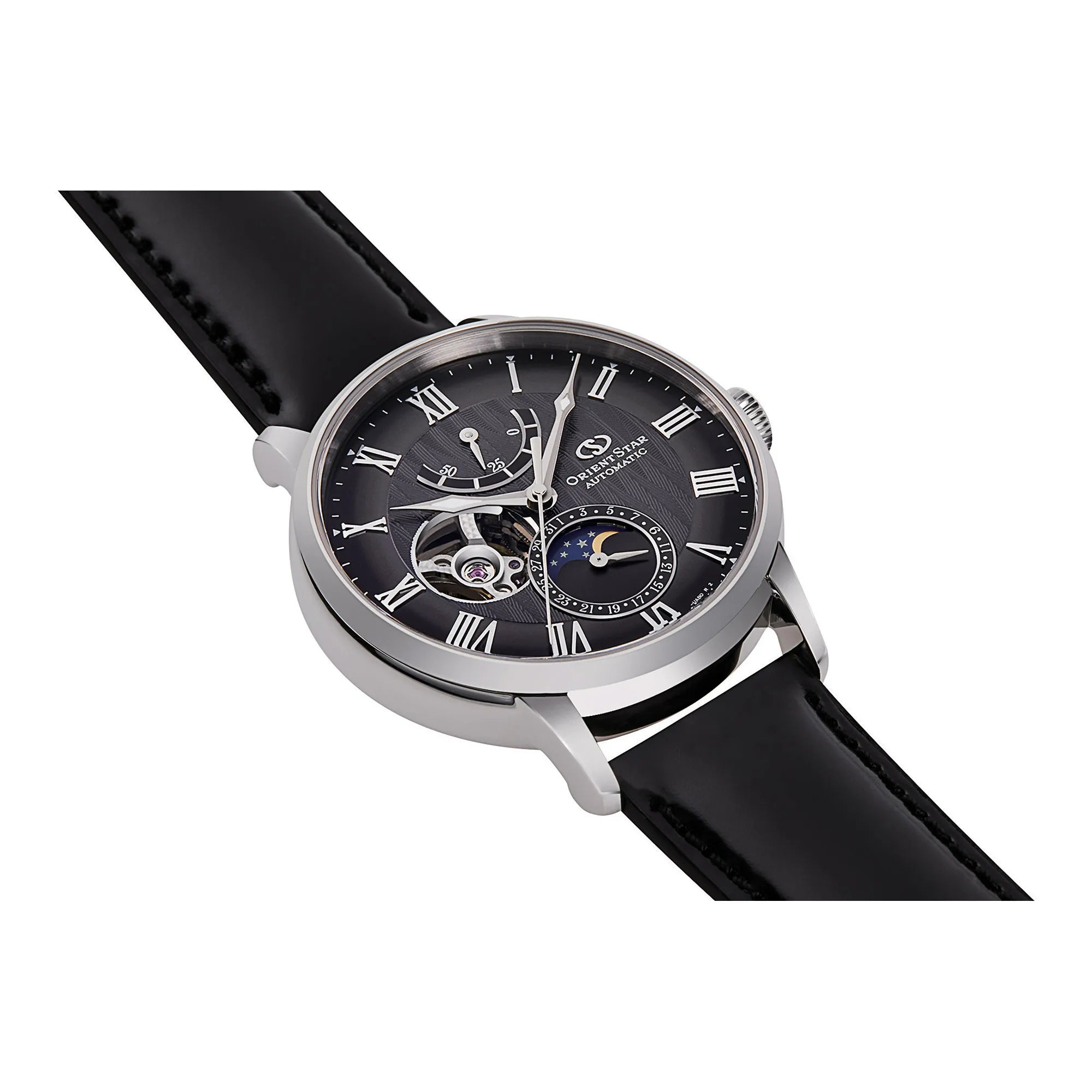Erleben Sie zeitlose Eleganz mit der ORIENT STAR Classic Moon Phase. Diese vornehme Herrenuhr ist nicht nur ein Schmuckstück, sondern ein Ausdruck feiner Persönlichkeit. Ihr fesselndes Zifferblatt, das den himmlischen Tanz zeigt, veredelt jeden Augenblick. Gefertigt mit einem edlen schwarzen Lederband und einem faszinierenden durchsichtigen Gehäuseboden, erzählt sie Geschichten von Präzision und Tradition. Stellen Sie sich vor, wie sie Ihr Handgelenk an einem unvergesslichen Abend schmückt und Ihren anspruchsvollen Geschmack widerspiegelt.