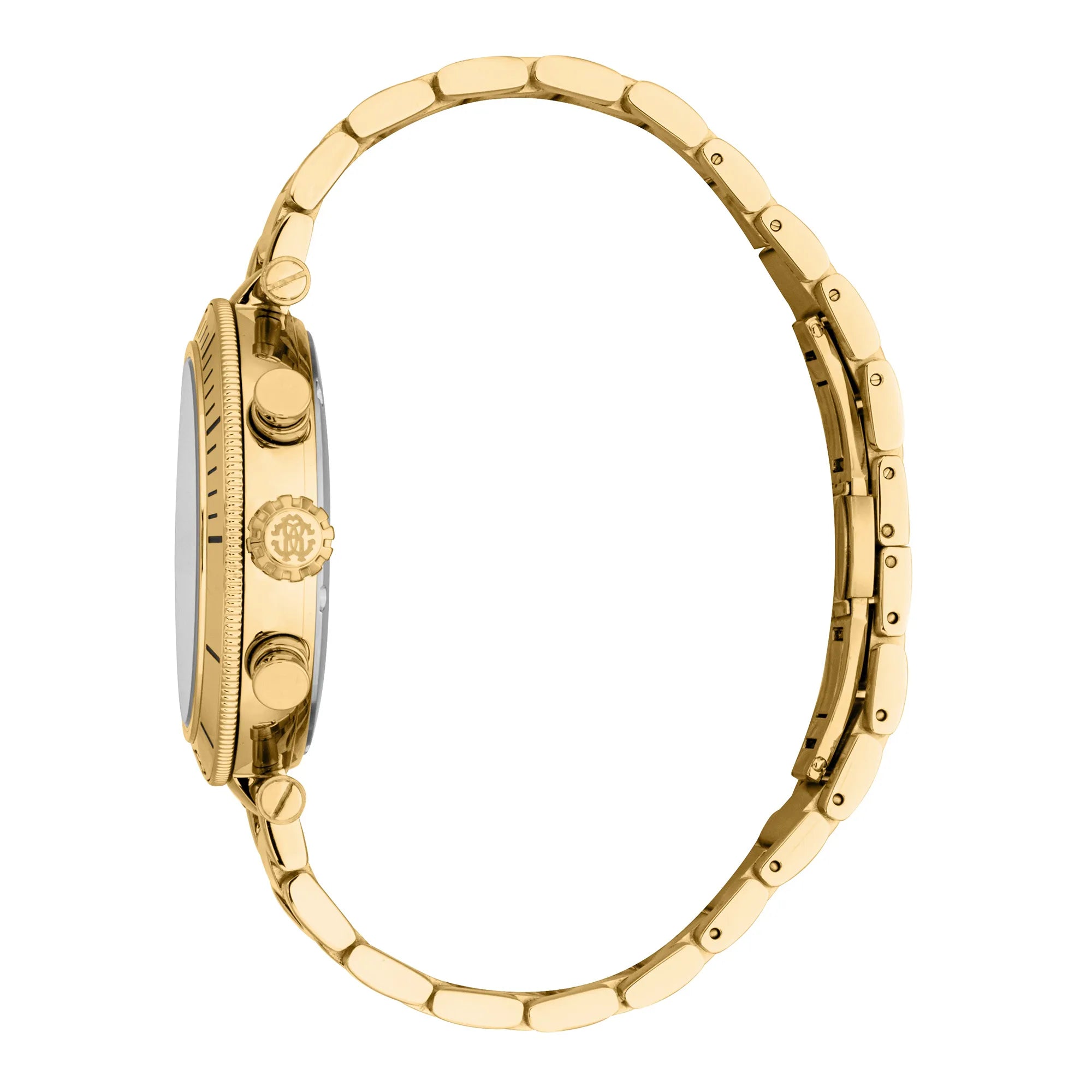 In der Welt der Uhrmacherkunst, wo Eleganz auf Präzision trifft, entsteht eine Uhr, die das Wesen von Raffinesse und Stil verkörpert. Gefertigt im Herzen der Schweizer Uhrmacherei, ist diese Roberto Cavalli Gent Uhr ein Zeugnis für das Engagement der Marke für Luxus und Innovation. Ihr rundes Gehäuse, getaucht in den Glanz von Gelbgold, zieht mit einem Durchmesser von 43 mm alle Blicke auf sich und setzt ein mutiges Statement am Handgelenk des anspruchsvollen Gentlemans. Das Mineralglas schützt ein auffälliges schwarzes Zifferblatt, auf dem die Kunst der Zeitmessung mit einer Chronographenanzeige und einem Datums-Kalender auf ein neues Niveau gehoben wird, angetrieben vom zuverlässigen JS25 Quarzwerk. Das raffinierte Design der Uhr wird durch ein Edelstahlarmband, ebenfalls in Gelbgold, weiter betont, das nahtlos mit einer Butterfly-Faltschließe mit Druckknopf für sicheren und mühelosen Tragekomfort integriert ist. Bis zu 100 Meter wasserdicht, ist diese Uhr so vielseitig wie elegant und bereit, ihren Träger vom Konferenzraum bis in die Tiefen des Ozeans zu begleiten. Die Pull & Push-Krone verleiht einen Hauch klassischen Charmes, während die 24-Stunden-Zeitanzeige sicherstellt, dass jeder Moment präzise erfasst wird. Diese Roberto Cavalli Uhr ist nicht nur ein Accessoire, sondern ein Statement für Mode und Funktionalität, ein Spiegelbild des modernen Mannes Wunsch nach Exzellenz und Stil.
