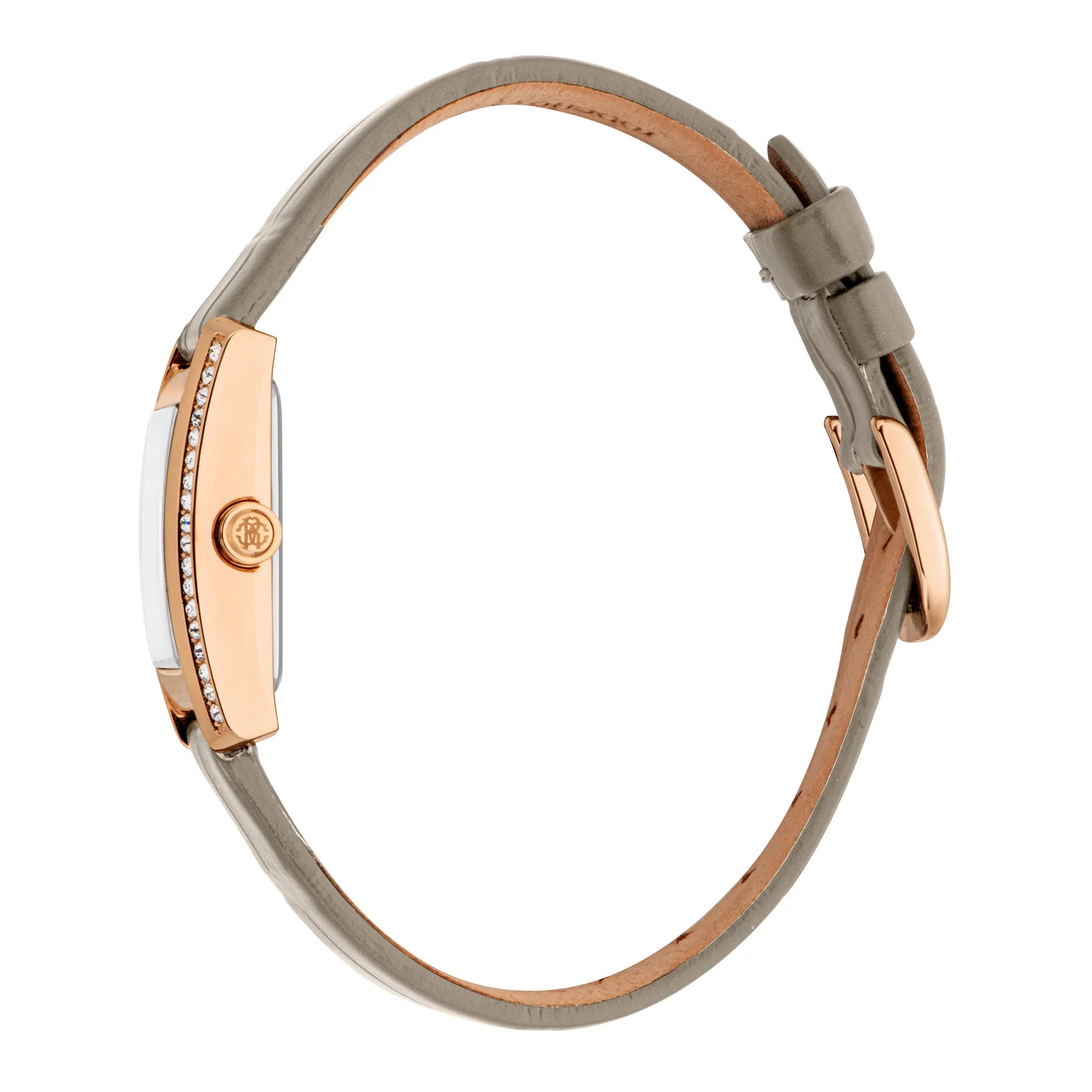 In der Welt der Mode, in der Eleganz auf Innovation trifft, entsteht eine Uhr, die das Wesen von Raffinesse und Stil einfängt. Gefertigt im Herzen der Schweizer Uhrmacherkunst, ist diese Roberto Cavalli Lady Uhr ein Zeugnis für verfeinertes Design und exquisite Handwerkskunst. Das rechteckige Gehäuse, getaucht in einen luxuriösen Roségoldton, strahlt eine zeitlose Anziehungskraft aus und ergänzt perfekt das zarte Handgelenk der modernen Frau. Das Mineralglas bietet einen klaren Blick auf das silbergraue Zifferblatt, auf dem drei Zeiger anmutig tanzen, angetrieben von der Präzision eines Quarzwerks mit GL34 Kaliber. Das hellgraue Lederarmband, gesichert mit einer Dornschließe, schmiegt sich bequem um das Handgelenk und verleiht jedem Outfit einen Hauch von zurückhaltender Eleganz. Wasserresistent ist diese Uhr ebenso praktisch wie schön und bereit, Sie auf den Abenteuern des Lebens zu begleiten. Die Pull & Push Krone sorgt für einfache Zeiteinstellungen und macht sie zu einem zuverlässigen Begleiter für die modebewusste Frau. Mit seiner harmonischen Mischung aus Farben und Materialien ist diese Roberto Cavalli Lady Uhr nicht nur ein Accessoire, sondern ein Statement von Stil und Anmut, das überall einen bleibenden Eindruck hinterlässt.