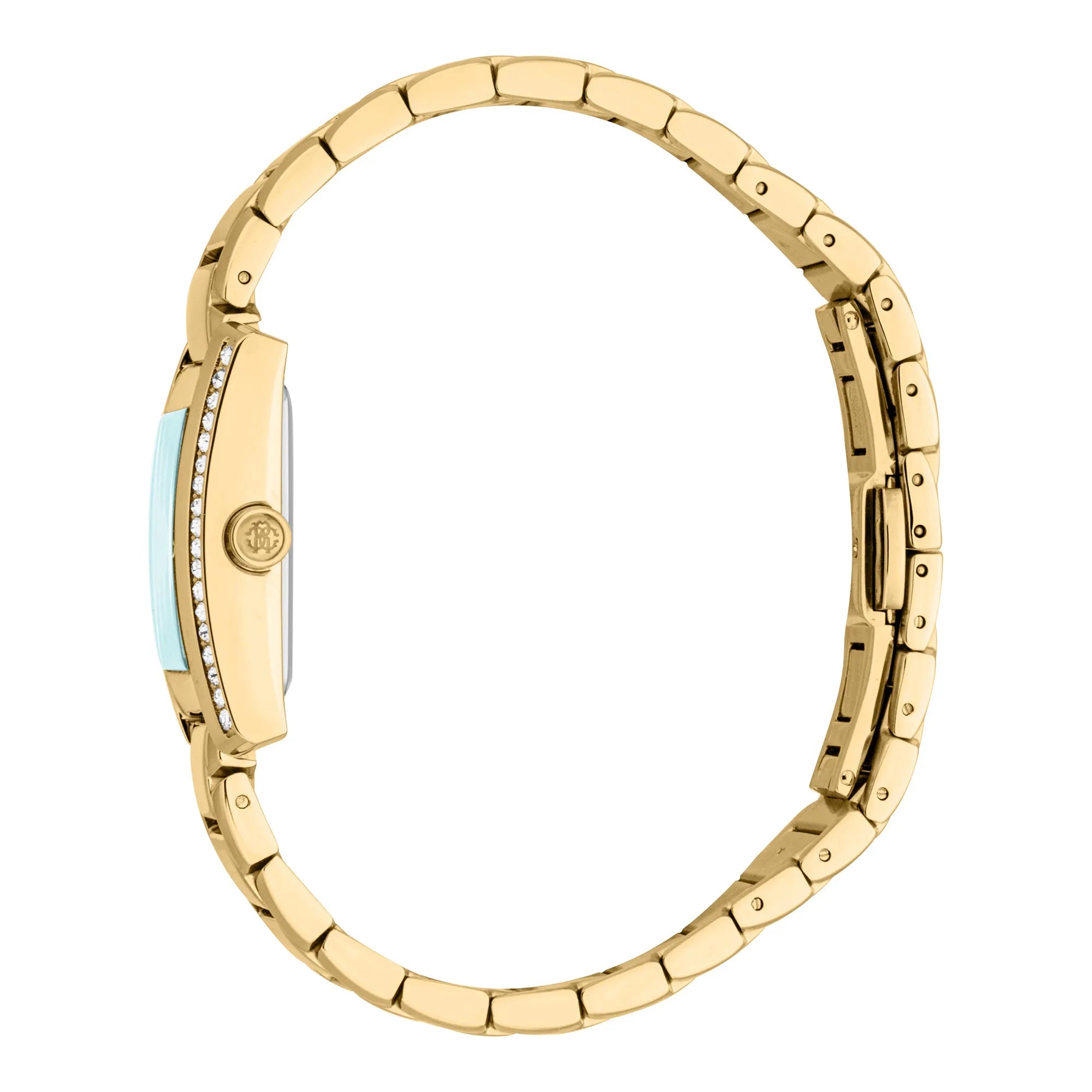 In der Welt der High Fashion, wo Eleganz auf Kühnheit trifft, entsteht eine Uhr, die das Wesen von Raffinesse und Stil einfängt. Gefertigt im Herzen der Schweizer Uhrmacherkunst, ist diese Roberto Cavalli Lady Uhr ein Zeugnis für verfeinertes Design und exquisite Handwerkskunst. Das rechteckige Gehäuse, getaucht in einen luxuriösen Gelbgoldton, strahlt eine Aura von Opulenz aus, perfekt ergänzt durch das passende Edelstahlarmband. Die Schmetterlingsfaltschließe mit Druckknopf sorgt für einen nahtlosen Sitz und verleiht diesem klassischen Stück einen Hauch von modernem Komfort. Das Zifferblatt, ein lebhaftes Türkis, bringt einen Farbtupfer ein, der den mutigen und abenteuerlustigen Geist seiner Trägerin widerspiegelt und es zu einem herausragenden Accessoire für jedes modebewusste Ensemble macht. Unter seinem Mineralglas beherbergt die Uhr ein präzises Quarzwerk, angetrieben vom Kaliber GL34, das eine genaue Zeitmessung gewährleistet. Die Pull & Push-Krone bietet eine einfache Einstellung, während die wasserfeste Eigenschaft Praktikabilität bietet, ohne den Stil zu beeinträchtigen. Diese Roberto Cavalli Uhr ist mehr als nur ein Zeitmesser, sie ist ein Statement von Eleganz und Individualität, entworfen für die Frau, die es wagt, in der Menge aufzufallen.