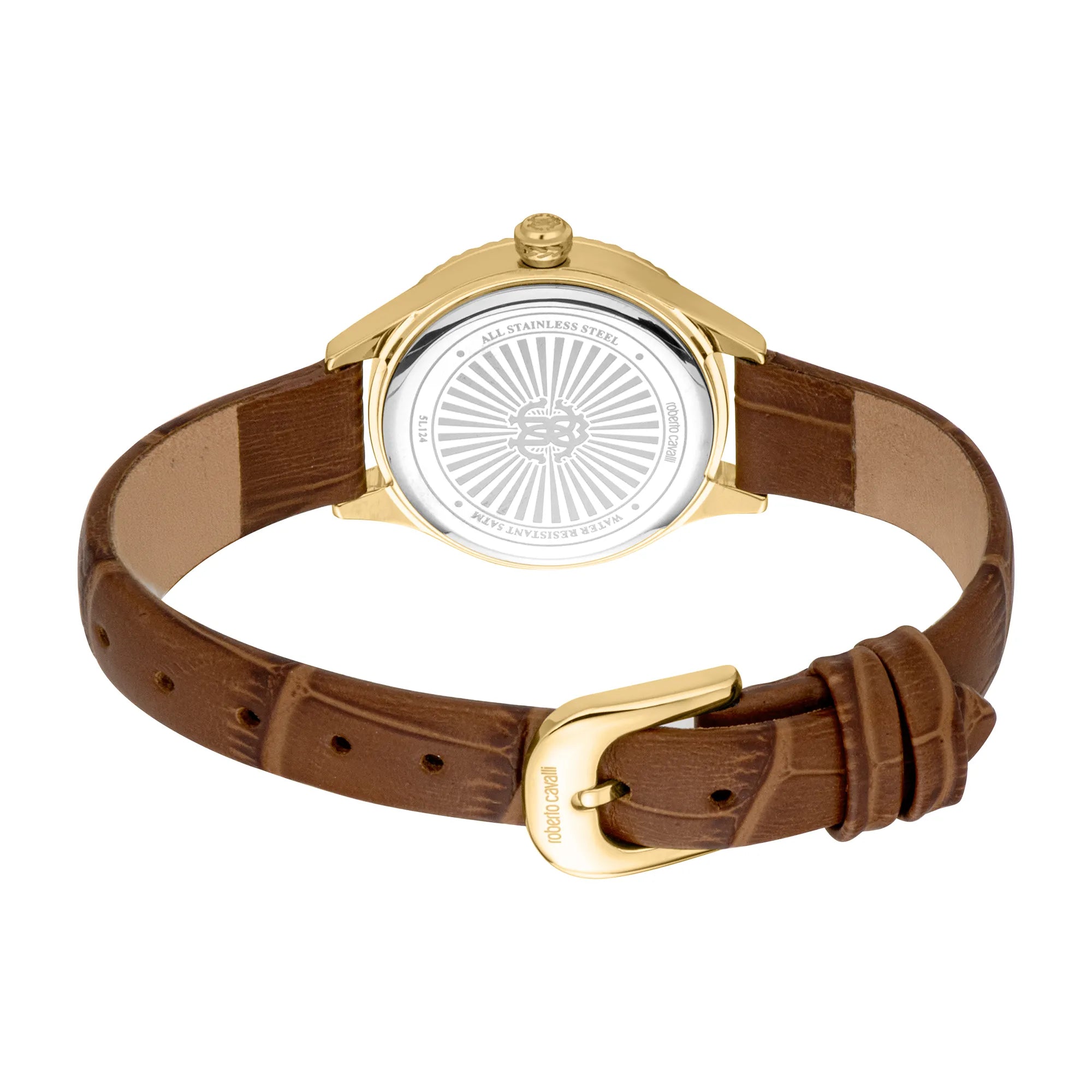 Diese Roberto Cavalli Lady Uhr mit ihrem Gehäuse aus Gelbgold und dem silbergrauen Zifferblatt ist ein Zeugnis zeitloser Eleganz. Das 28 mm runde Gehäuse wird durch ein braunes Lederarmband ergänzt, das mit einer Dornschließe gesichert ist. Die Wasserdichtigkeit WR 50mt sorgt dafür, dass sie für jeden Anlass bereit ist.