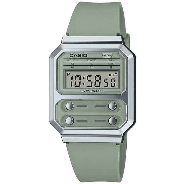 In einer Welt, in der Zeit sowohl ein Luxus als auch eine Notwendigkeit ist, erscheint die CASIO Retro Vintage Uhr als ein Leuchtturm zeitlosen Stils und Funktionalität. Im Geist der 80er Jahre gefertigt, fängt diese Unisex-Uhr die Essenz lässiger Eleganz mit ihrem schlanken rechteckigen Gehäuse ein, das in einem raffinierten Silbergrau ausgeführt ist. Das raffinierte Design der Uhr wird durch ein lebhaftes grünes Kautschukarmband ergänzt, das einen Hauch modernen Flairs zu ihren Vintage-Wurzeln hinzufügt. Das grüne Zifferblatt, das harmonisch zum Armband passt, bietet einen Farbtupfer, der den mutigen und abenteuerlustigen Geist seines Trägers widerspiegelt. Ausgestattet mit einem digitalen Display sorgt diese Uhr mit ihrem Quarzwerk für Präzision, während der Tages-, Datums- und Monatskalender Sie mühelos organisiert hält. Die Pull & Push-Krone und die Dornschließe bieten Benutzerfreundlichkeit und machen sie zu einer praktischen Wahl für den täglichen Gebrauch. Wasserfest und mit Alarm- und Lichtfunktion ausgestattet, ist diese Uhr so vielseitig wie stilvoll und bereit, Sie auf jedem Abenteuer zu begleiten. Ob Sie durch den urbanen Dschungel navigieren oder einen entspannten Tag genießen, die CASIO Retro Vintage Uhr ist Ihr perfekter Begleiter, der Nostalgie mit zeitgenössischem Charme in einem nahtlosen Tanz von Zeit und Stil verbindet.