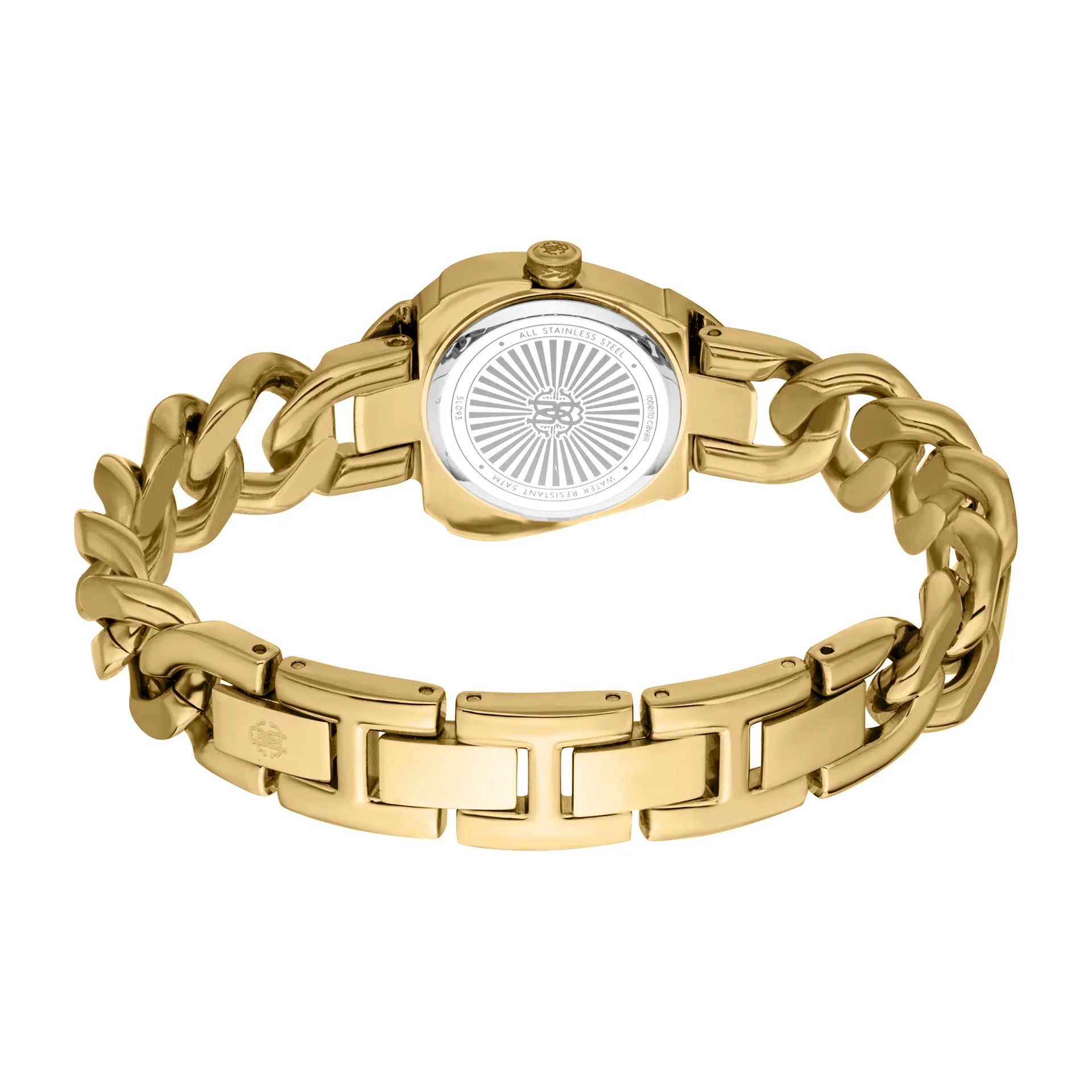 Die Roberto Cavalli Lady Uhr in Gelbgold ist ein Meisterwerk der Eleganz. Ihr unregelmäßiges Gehäuse und das flaschengrüne Zifferblatt schaffen einen faszinierenden Kontrast, während das Edelstahlarmband und der Schmuckverschluss einen Hauch von Raffinesse hinzufügen. Wasserbeständig, ist sie für die Frau konzipiert, die einen raffinierten Stil schätzt.