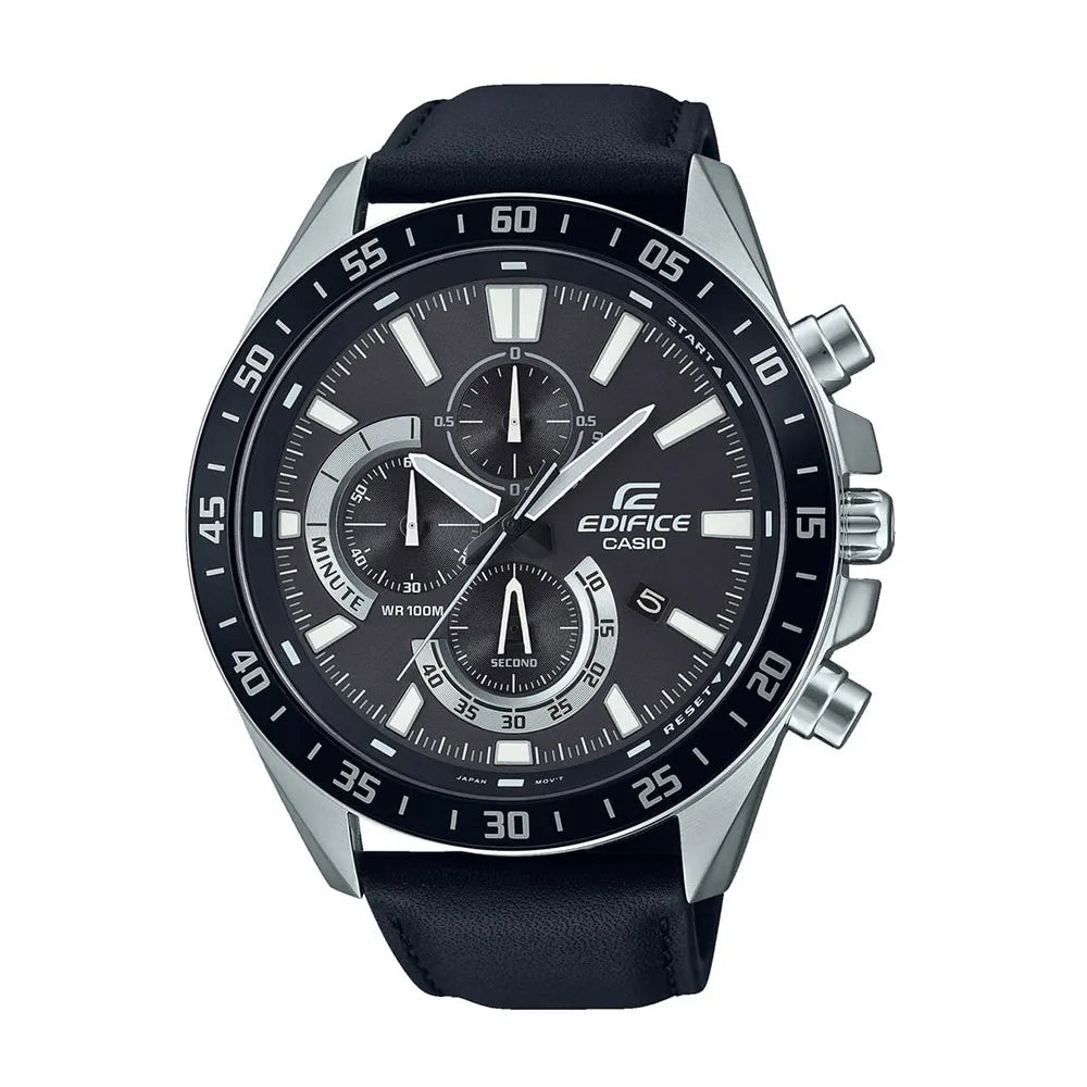 Entdecken Sie die Essenz lässiger Eleganz mit der CASIO Edifice. Dieses silbergraue rundes Gehäuse, kombiniert mit einem schwarzen Lederarmband, strahlt Raffinesse aus. Das Mineralglas und die 100m Wasserdichtigkeit gewährleisten Langlebigkeit, während die Pull & Push-Krone nahtlose Funktionalität bietet.