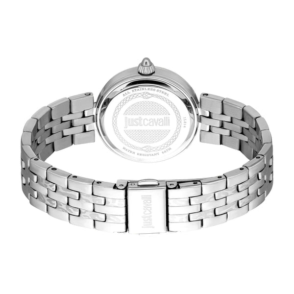 Die Just Cavalli Preziosa verzaubert mit ihrem silbergrauen Gehäuse und dem nachtblauen Zifferblatt, eine raffinierte Mischung aus Eleganz und Stil. Das Edelstahlarmband und die Butterfly-Faltschließe sorgen für eine nahtlose Passform und machen sie zu einem zeitlosen Stück für die anspruchsvolle Frau.