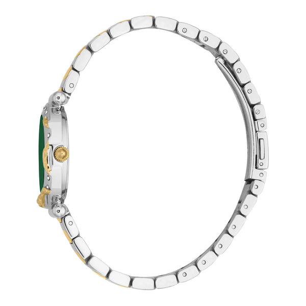 Im Bereich der Mode, wo Eleganz auf Kühnheit trifft, entsteht eine Uhr, die den Geist der modernen Frau verkörpert: die Just Cavalli Watch aus der Stella Snake Kollektion. Gefertigt im Herzen der Schweizer Präzision, ist dieses exquisite Accessoire ein Zeugnis für das Engagement der Marke für mutiges Design und verfeinerte Handwerkskunst. Das runde Gehäuse, getaucht in einen luxuriösen Gelbgoldton, fängt das Licht bei jeder Bewegung ein und zieht die Aufmerksamkeit auf seine anspruchsvolle Ausstrahlung. Mit einem zarten Durchmesser von 28 mm sitzt es anmutig am Handgelenk, eine perfekte Mischung aus Zurückhaltung und Statement. Das flaschengrüne Zifferblatt, das an tiefe, üppige Wälder erinnert, verleiht einen Hauch von Geheimnis und Tiefe, während die Drei-Zeiger-Anzeige sicherstellt, dass die Zeit immer auf Ihrer Seite ist. Eingefasst in Mineralglas bietet die Uhr einen klaren Blick auf ihre filigranen Details, geschützt vor den Elementen mit einer Wasserdichtigkeit von bis zu 50 Metern. Das Edelstahlarmband, ebenfalls in Gelbgold, umschließt das Handgelenk mit einem Gefühl von Kontinuität und Eleganz, gesichert durch eine Faltschließe mit Druckknopf für Komfort und Sicherheit. Diese Just Cavalli Watch ist nicht nur ein Accessoire, sondern eine Stil- und Charaktererklärung, ein Stück, das diejenigen anspricht, die es wagen, aufzufallen und ihren einzigartigen Stil zu leben.