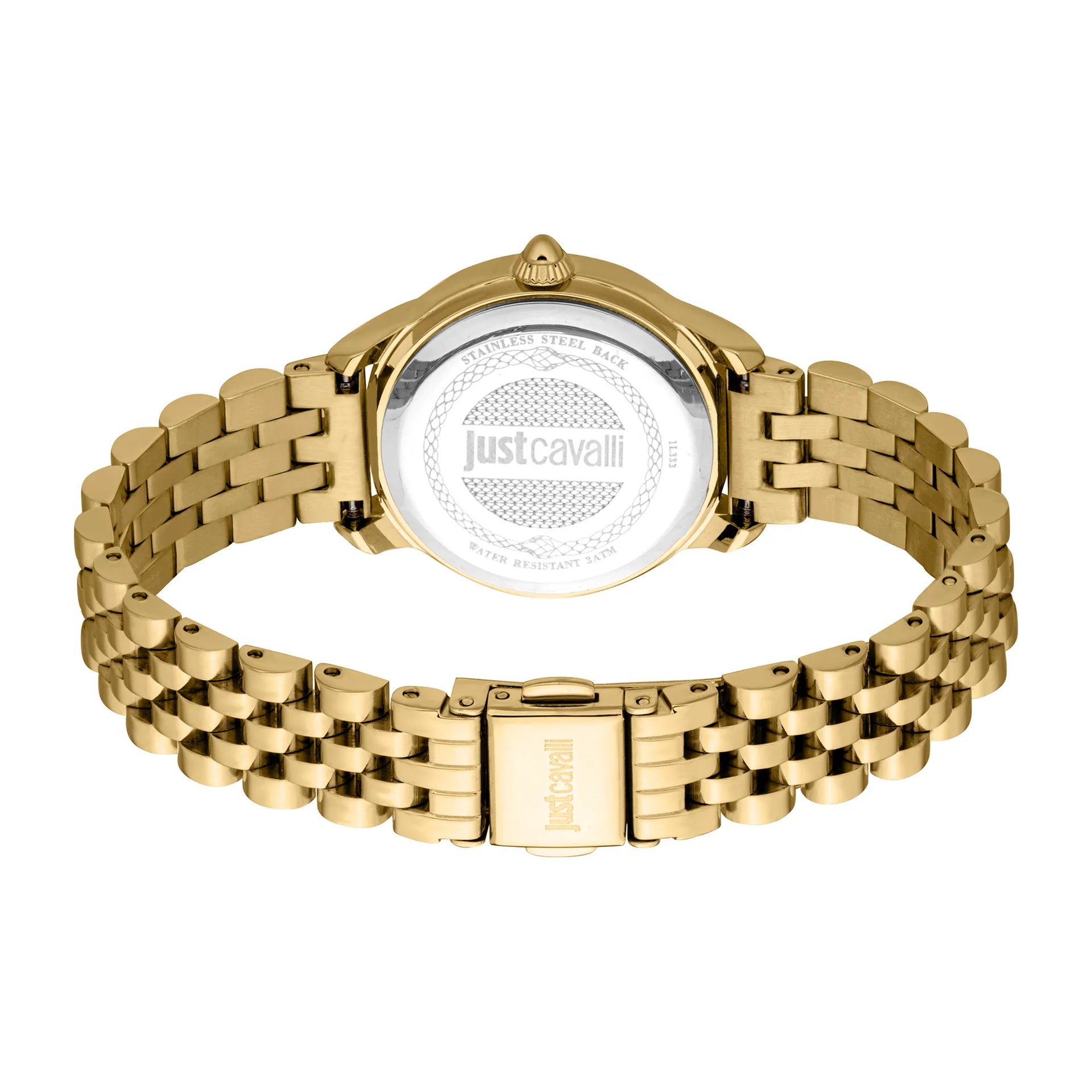Im Bereich der Mode, wo Eleganz auf Kühnheit trifft, entsteht eine Uhr, die das Wesen von Raffinesse und Mut einfängt. Diese Just Cavalli Uhr aus der illustren JC1L333 Allegra Kollektion ist ein Zeugnis für das Engagement der Marke für Stil und Innovation. Gefertigt im Herzen der Just Cavalli Animalier Familie, verkörpert sie eine perfekte Mischung aus modischem Design und zeitloser Anziehungskraft. Das runde Gehäuse, getaucht in einen luxuriösen Gelbgoldton, strahlt eine Aura von Opulenz aus, während sein Durchmesser von 30 mm eine zarte, aber auffällige Präsenz am Handgelenk gewährleistet. Das flaschengrüne Zifferblatt, das an üppige, grüne Landschaften erinnert, verleiht einen Hauch von Geheimnis und Tiefe und ergänzt das raffinierte Design der Uhr perfekt. Eingefasst in Mineralglas, ist das Zifferblatt mit einer Klarheit geschützt, die seine lebendige Farbe hervorhebt. Das Edelstahlarmband, ebenfalls in Gelbgold, umschließt das Handgelenk mit einem Gefühl von Kontinuität und Anmut, gesichert durch eine Faltschließe mit Druckknopf für Komfort und Sicherheit. Wasserresistent und angetrieben von präzisem Quarzwerk, ist diese Uhr nicht nur ein Zeitmesser, sondern ein Statement von Stil und Selbstbewusstsein. Die Pull & Push Krone fügt einen Hauch von Praktikabilität hinzu und stellt sicher, dass dieses exquisite Stück ebenso funktional wie schön ist. Entworfen für die moderne Frau, die Mode mit einem furchtlosen Geist annimmt, ist diese Just Cavalli Uhr mehr als ein Accessoire, sie ist eine Verkörperung von Charakter und Eleganz, ein wahrer Spiegel des kühnen Geistes, der die Just Cavalli Marke definiert.
