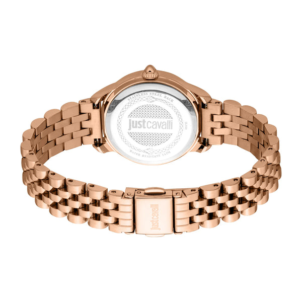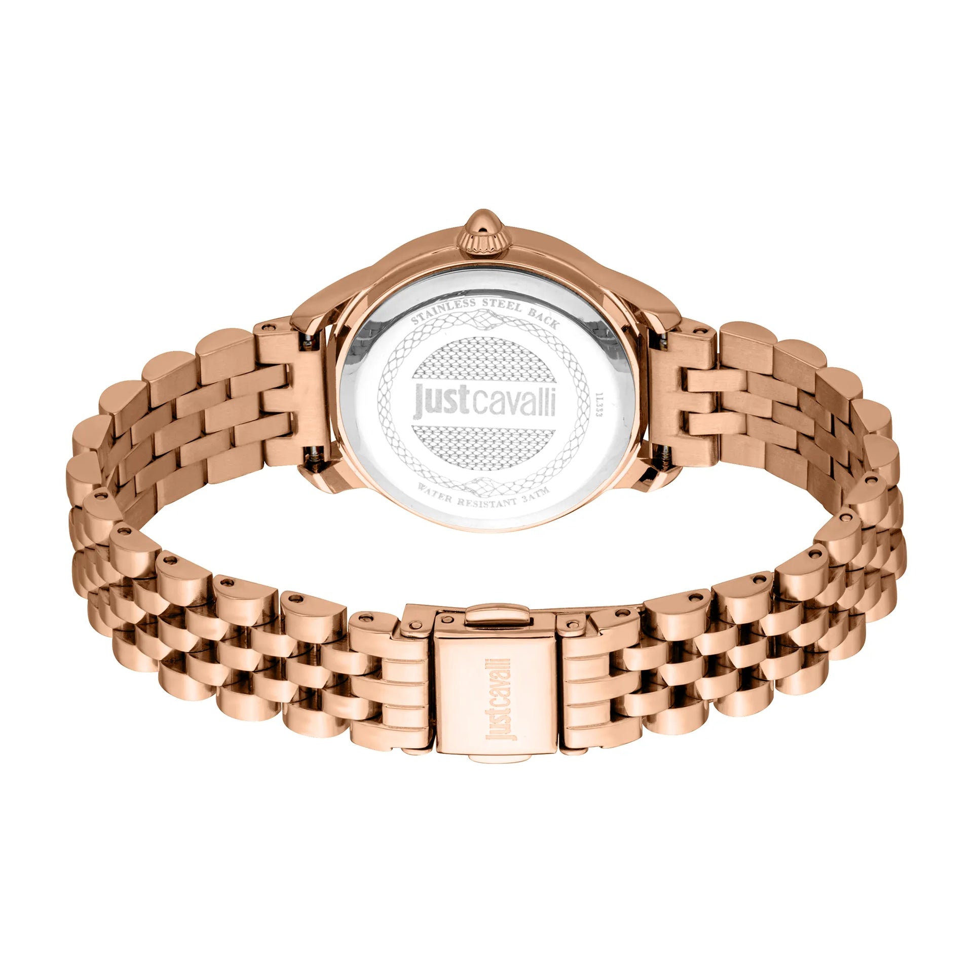 Im Bereich der Mode, wo Eleganz auf Kühnheit trifft, entsteht eine Uhr, die das Wesen moderner Raffinesse einfängt. Gefertigt im Herzen der Schweizer Uhrmacherkunst, ist diese Just Cavalli Uhr aus der illustren Animalier Kollektion ein Zeugnis für das Engagement der Marke für mutiges Design und verfeinerte Handwerkskunst. Das runde Gehäuse, getaucht in einen luxuriösen Roségoldton, strahlt eine zeitlose Anziehungskraft aus und ergänzt perfekt das lebendige grüne Zifferblatt, das jedem Ensemble einen Farbtupfer verleiht. Dieser auffällige Kontrast hebt nicht nur den modischen Stil der Uhr hervor, sondern verweist auch auf eine verspielte, pop-inspirierte Ästhetik, die sowohl gewagt als auch schick ist. Das Edelstahlarmband, ebenfalls in Roségold, schmiegt sich elegant um das Handgelenk und wird durch eine Faltschließe mit Druckknopf für Komfort und Benutzerfreundlichkeit gesichert. Mit einem Gehäusedurchmesser von 30 mm ist diese Uhr für die moderne Frau konzipiert, die sowohl Stil als auch Substanz schätzt. Das Mineralglas schützt das Zifferblatt und sorgt für Klarheit und Haltbarkeit, während die Pull & Push Krone nahtlose Zeiteinstellungen ermöglicht. Wasserbeständig und angetrieben von präzisem Quarzwerk ist diese Uhr ebenso funktional wie modisch. Eine wahre Verkörperung des furchtlosen Geistes von Just Cavalli, ist diese Uhr nicht nur ein Accessoire, sondern ein Ausdruck von Charakter und Selbstbewusstsein, bereit, Sie auf jedem Abenteuer mit ihrem unbestreitbaren Charme und Anmut zu begleiten.
