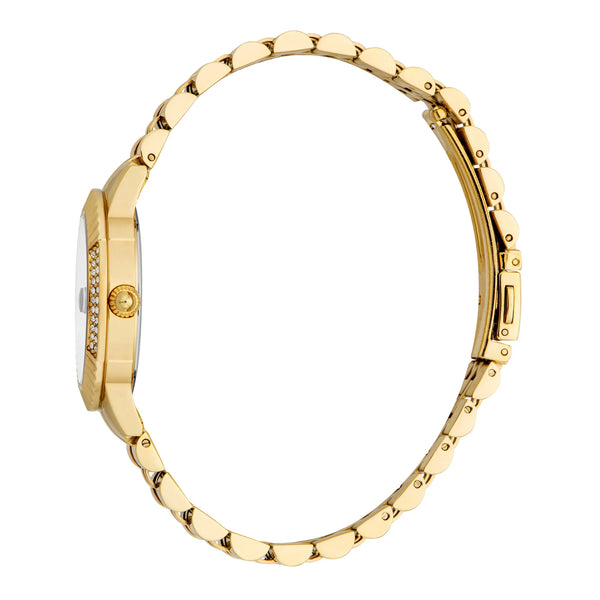 Im Reich zeitloser Eleganz, wo Mode auf Funktion trifft, entsteht ein Meisterwerk, das die Essenz von Raffinesse und Stil einfängt. Diese Just Cavalli Uhr aus der berühmten Just Cavalli Glam Chic Kollektion ist ein Zeugnis für das Engagement der Marke für exquisites Design und unvergleichliche Handwerkskunst. Gefertigt in einem strahlenden Gelbgoldton, strahlt das runde Gehäuse mit einem Durchmesser von 32 mm einen luxuriösen Charme aus, der sowohl kühn als auch raffiniert ist. Das Edelstahlarmband, ebenfalls in passendem Gelbgold, schmiegt sich mit nahtloser Anmut ums Handgelenk und wird durch eine Butterfly-Faltschließe mit Druckknopf für Komfort und Benutzerfreundlichkeit gesichert. Das silbergraue Zifferblatt, eine Leinwand zurückhaltender Eleganz, ist mit drei Zeigern und einem Datumsanzeiger versehen, angetrieben von der Präzision eines Quarzwerks mit VJ32 Kaliber. Diese Uhr ist nicht nur ein Zeitmesser, sondern ein Statement für modebewusstes Denken, perfekt für die moderne Frau, die die schönen Dinge des Lebens schätzt. Wasserresistent und geschützt durch ein Mineralglas, ist sie darauf ausgelegt, den Strapazen des täglichen Gebrauchs standzuhalten und dabei ihre makellose Ausstrahlung zu bewahren. Die Pull & Push Krone verleiht einen Hauch von Praktikabilität und stellt sicher, dass diese Uhr ebenso funktional wie schön ist. Mit ihrem silbergrauen Akzent vor dem goldenen Hintergrund ist diese Uhr eine Feier des zeitgenössischen Stils und macht sie zu einem unverzichtbaren Accessoire für diejenigen, die es wagen, in der Menge aufzufallen.
