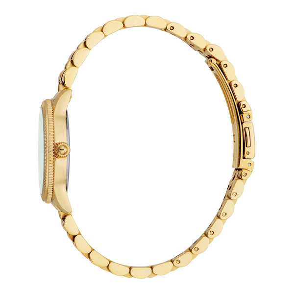 Ein flaschengrünes Zifferblatt vor einem Gehäuse aus Gelbgold definiert die einzigartige Anziehungskraft der Lovestruck Valentines Uhr. Das Edelstahlarmband und die Butterfly-Faltschließe verleihen Raffinesse, während Wasserbeständigkeit und ein Mineralglas für Langlebigkeit sorgen. Dieses Stück ist ein Zeugnis für die gewagte Eleganz von Just Cavalli.