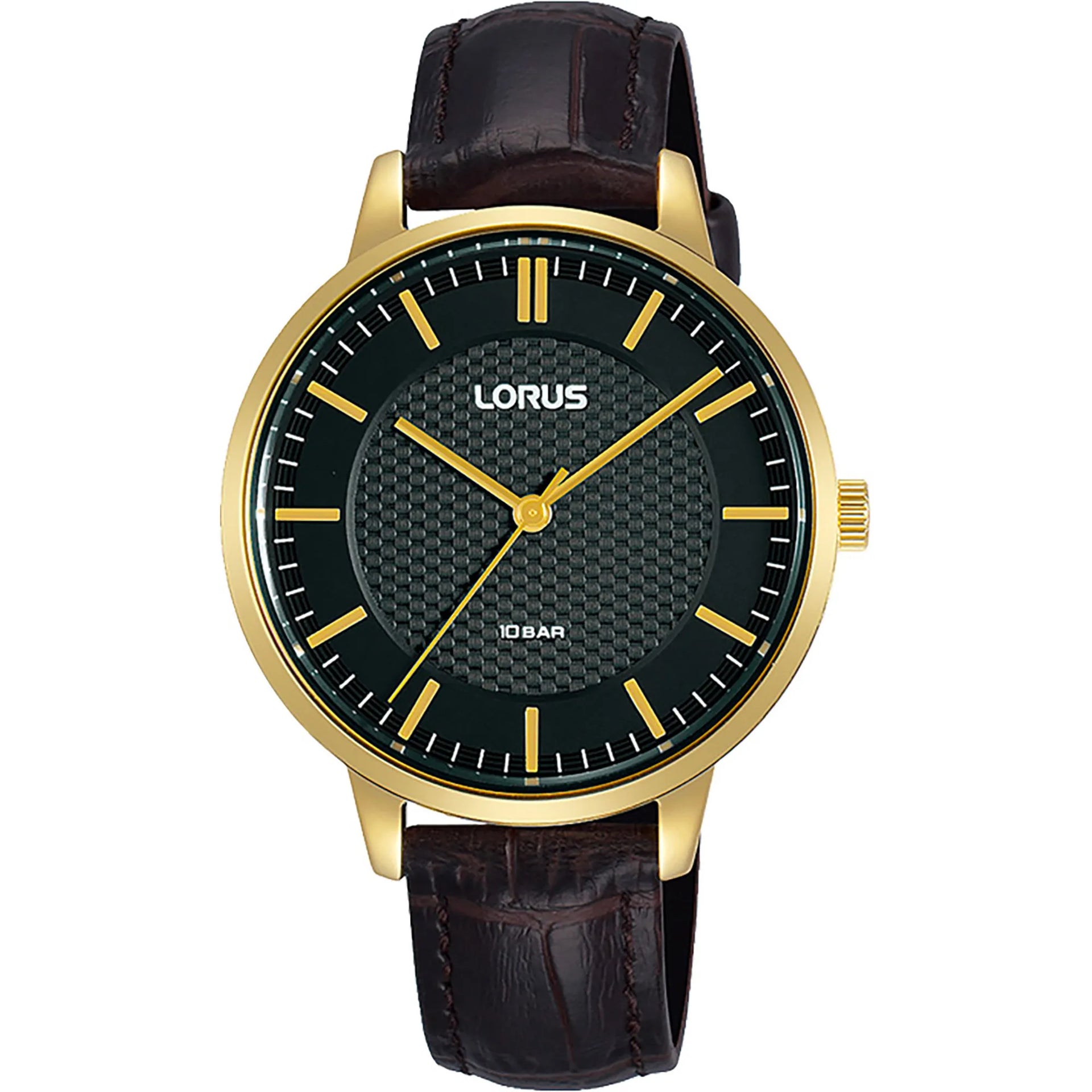 Die Lorus Lady Uhr ist ein klassisches Meisterwerk mit einem 34mm Gehäuse aus Gelbgold und einem schokoladenbraunen Lederarmband. Ihr schwarzes Zifferblatt und die WR 100mt Wasserdichtigkeit bieten eine raffinierte Eleganz, perfekt für diejenigen, die zeitlosen Stil schätzen.