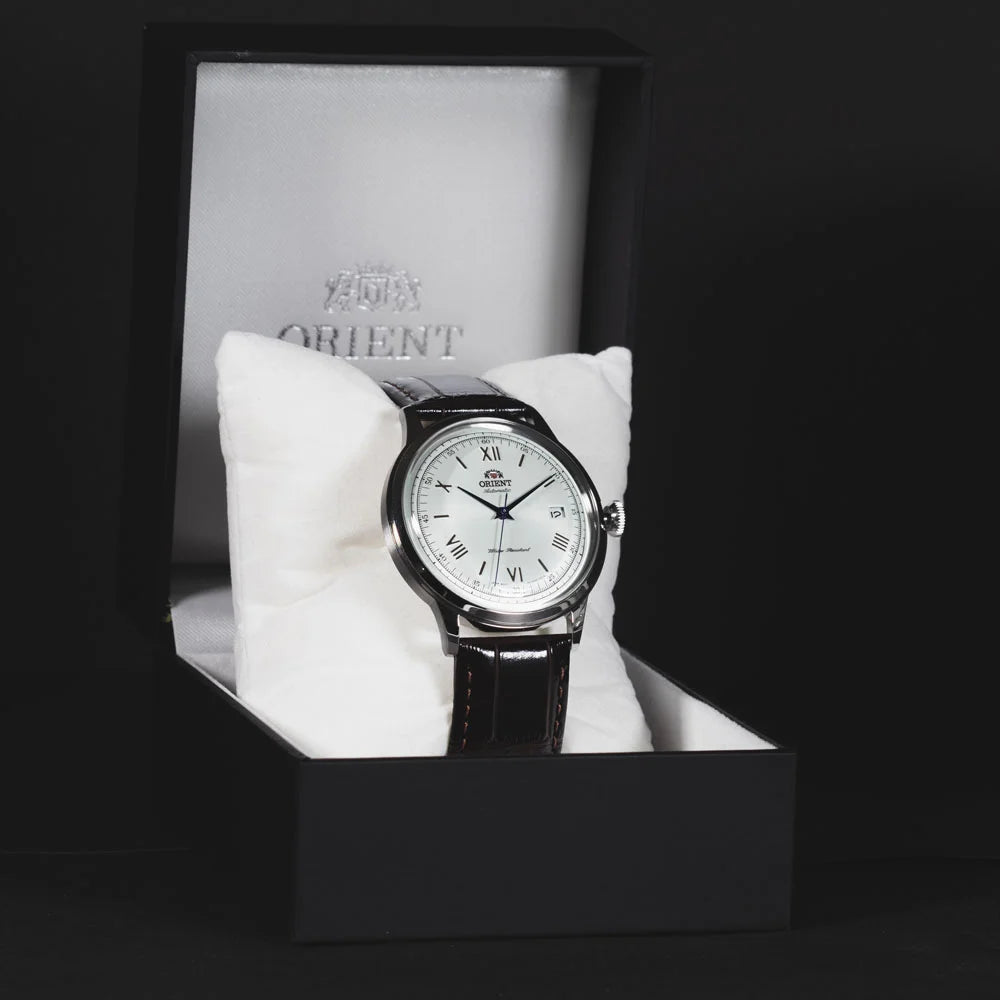 Im Reich zeitloser Eleganz erscheint die ORIENT AC00 Bambino V2 als ein Leuchtturm klassischer Raffinesse. Mit akribischer Liebe zum Detail gefertigt, ist diese ORIENT Classic Uhr ein Zeugnis der Kunst der Uhrmacherei. Ihr rundes Gehäuse, getaucht in einen edlen silbergrauen Farbton, umschließt ein hellgraues Zifferblatt, das zurückhaltenden Charme ausstrahlt. Die harmonische Farbkombination wird durch ein braunes Lederarmband ergänzt, das mit einer traditionellen Dornschließe gesichert ist und sowohl Komfort als auch Stil bietet. Im Herzen dieses Meisterwerks liegt das mechanische Uhrwerk, angetrieben vom Kaliber F6724 mit 22 Steinen, das Präzision mit einer täglichen Genauigkeit von +25/-15 gewährleistet. Die Fähigkeit der Uhr, sowohl von Hand aufgezogen als auch automatisch betrieben zu werden, spricht für ihre Vielseitigkeit und erfüllt die Bedürfnisse des modernen Gentlemans. Wasserresistent und geschützt durch ein Mineralglas verspricht sie Haltbarkeit, ohne Eleganz einzubüßen. Die Pull & Push-Krone und der Datumsanzeiger verleihen ihrem klassischen Design funktionalen Charme. Diese ORIENT Uhr ist nicht nur ein Zeitmesser, sondern ein Statement für raffinierten Geschmack, perfekt für diejenigen, die die subtilen Nuancen klassischen Stils schätzen.