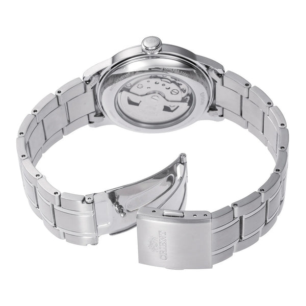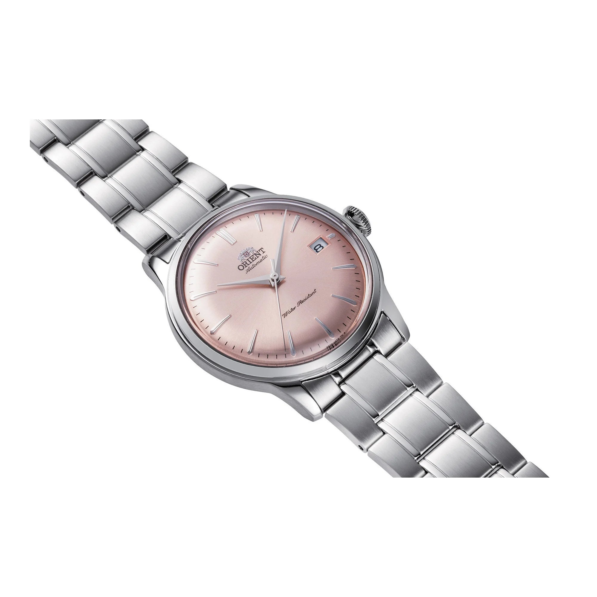 Im Reich zeitloser Eleganz erhebt sich die ORIENT AC0M Bambino 38mm als ein Leuchtturm klassischer Raffinesse. Gefertigt im Herzen horologischer Exzellenz, verkörpert diese Uhr die perfekte Verbindung von Tradition und Moderne. Ihr rundes Gehäuse, getaucht in ein edles Silbergrau, umschließt ein Zifferblatt in Lachsrosa – ein Farbton, der von Subtilität und Charme flüstert und zugleich einen Hauch zeitgenössischer Note andeutet. Das Mineralglas schützt das Zifferblatt und gewährleistet Klarheit und Widerstandsfähigkeit, während der transparente Boden einen Blick auf den filigranen Tanz ihres mechanischen Herzens bietet. Mit einem Gehäusedurchmesser von 38 mm sitzt sie anmutig am Handgelenk, ein Zeugnis zurückhaltenden Luxus. Das Edelstahlarmband, das in seinem silbergrauen Glanz dem Gehäuse entspricht, wird mit einer Faltschließe mit Druckknopf und Sicherheitsverschluss sicher befestigt. Diese ORIENT Classic Uhr ist nicht nur ein Zeitmesser, sondern ein Statement von raffiniertem Geschmack. Das mechanische Werk, angetrieben vom Kaliber F6724 mit 22 Steinen, verspricht Präzision mit einer täglichen Genauigkeit von +25/-15. Ob von Hand aufgezogen oder automatisch, es passt sich dem Rhythmus seines Trägers an. Wasserbeständig und mit einem Datumsanzeiger ausgestattet, ist sie ebenso funktional wie schön. Für den anspruchsvollen Gentleman ist diese Uhr mehr als ein Accessoire, sie ist ein Begleiter auf der Reise durch die Zeit, ein Spiegelbild beständigen Stils und makelloser Handwerkskunst.