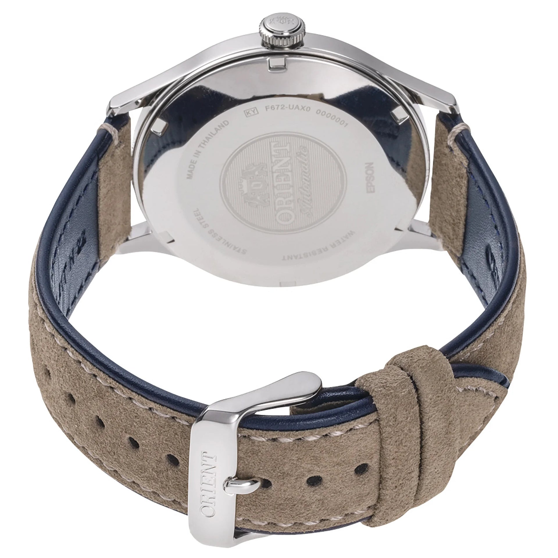 Im Reich zeitloser Eleganz erscheint die ORIENT AC0P Bambino V4 als ein Leuchtturm der Raffinesse und des Stils. Präzise gefertigt, ist diese ORIENT Classic Uhr ein Zeugnis der Kunst der Uhrmacherei, entworfen für den modernen Mann, der die feinen Dinge des Lebens schätzt. Ihr rundes Gehäuse, getaucht in einen eleganten silbergrauen Farbton, misst beeindruckende 42 mm im Durchmesser und strahlt eine raffinierte Präsenz am Handgelenk aus. Das Mineralglas schützt ein faszinierendes nachtblaues Zifferblatt, das an einen sternenklaren Himmel erinnert, auf dem drei Zeiger anmutig über die Oberfläche gleiten und den Lauf der Zeit mit müheloser Eleganz markieren. Das beige Lederarmband, gesichert mit einer Dornschließe, verleiht einen Hauch von legerer Eleganz und macht sie zum perfekten Begleiter für jeden Anlass. Unter ihrem exquisiten Äußeren liegt das Herz der Uhr – ein mechanisches Uhrwerk, angetrieben vom Kaliber F6724, das 22 Steine besitzt und sowohl Handaufzug als auch automatische Funktionen bietet. Mit einer täglichen Genauigkeit von +25/-15 sorgt dieses Zeitmessgerät für Präzision in jedem Moment. Die Datumsanzeige fügt ihrer Anziehungskraft Praktikabilität hinzu, während die Pull & Push-Krone einfache Einstellungen ermöglicht. Wasserbeständig, ist diese Uhr bereit, Sie durch die Abenteuer des Lebens zu begleiten, egal ob Sie sich im urbanen Dschungel bewegen oder einen entspannten Tag am Wasser genießen. Die ORIENT AC0P Bambino V4 ist nicht nur eine Uhr, sie ist ein Statement für raffinierten Geschmack und zeitlosen Stil, ein wahrer Begleiter für den anspruchsvollen Gentleman, der sowohl Form als auch Funktion in seinem Alltag schätzt.