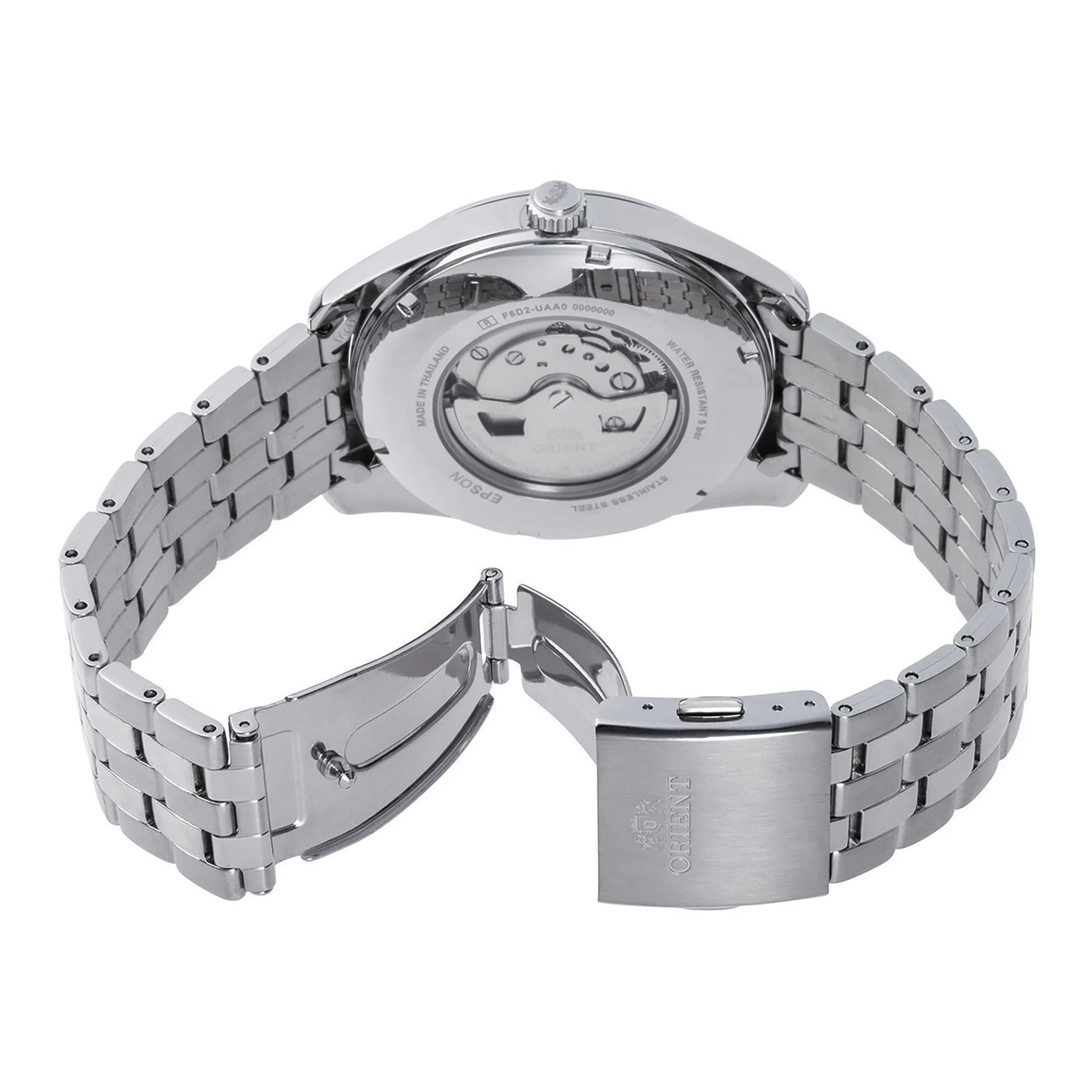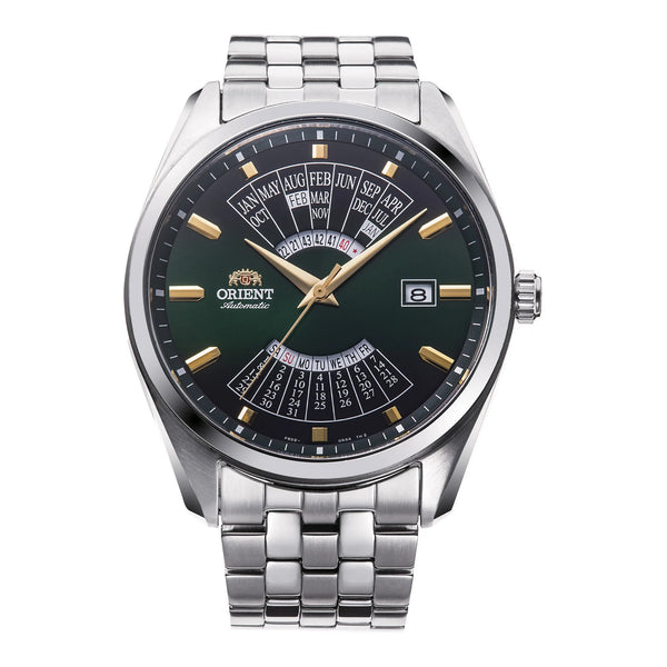 Im Bereich der Zeitmesser, wo Eleganz auf Funktionalität trifft, entsteht eine Kreation, die das Wesen moderner Raffinesse einfängt: die ORIENT BA00 Multi Year Calendar. Gefertigt im Herzen horologischer Innovation, ist diese Uhr ein Zeugnis der Kunst der Uhrmacherei, die Stil und Präzision nahtlos verbindet. Ihr rundes Gehäuse, getaucht in ein elegantes Silbergrau, strahlt ein raffiniertes Design aus, das den zeitgenössischen Gentleman anspricht. Mit einem beeindruckenden Durchmesser von 43 mm setzt sie ein Statement, ohne ein Wort zu sagen. Das Mineralglas schützt ein lebendiges grünes Zifferblatt, ein Hinweis auf einen Farbtupfer, der Konventionen trotzt und Bewunderung einlädt. Unter der Oberfläche verbirgt sich das mechanische Wunderwerk des Kalibers F6D22, das mit 22 Steinen eine Symphonie der Bewegung gewährleistet, egal ob von Hand aufgezogen oder automatisch. Der transparente Boden bietet einen Einblick in den komplexen Tanz von Zahnrädern und Federn, ein Geheimnis, das nur mit dem Träger geteilt wird. Das Edelstahlarmband, das farblich zum Gehäuse in Silbergrau passt, umschließt das Handgelenk mit einem Gefühl der Kontinuität, gesichert durch eine Faltschließe mit Druckknopf für Komfort und Sicherheit. Bis zu 50 Meter wasserdicht, ist diese Uhr ebenso vielseitig wie stilvoll und bereit, ihren Besitzer von legeren Ausflügen bis zu formelleren Anlässen zu begleiten. Der Multi Year Calendar, der Tag, Datum, Monat und Jahr anzeigt, ist ein Beweis für ihre Funktionalität und stellt sicher, dass die Zeit immer auf Ihrer Seite ist. Die ORIENT BA00 Multi Year Calendar ist nicht nur eine Uhr, sie ist ein Begleiter für den modernen Mann, eine Mischung aus Tradition und Innovation, gefertigt, um die Zeit zu überdauern.