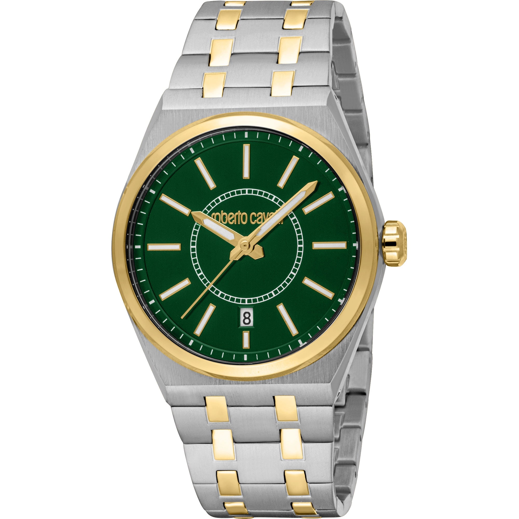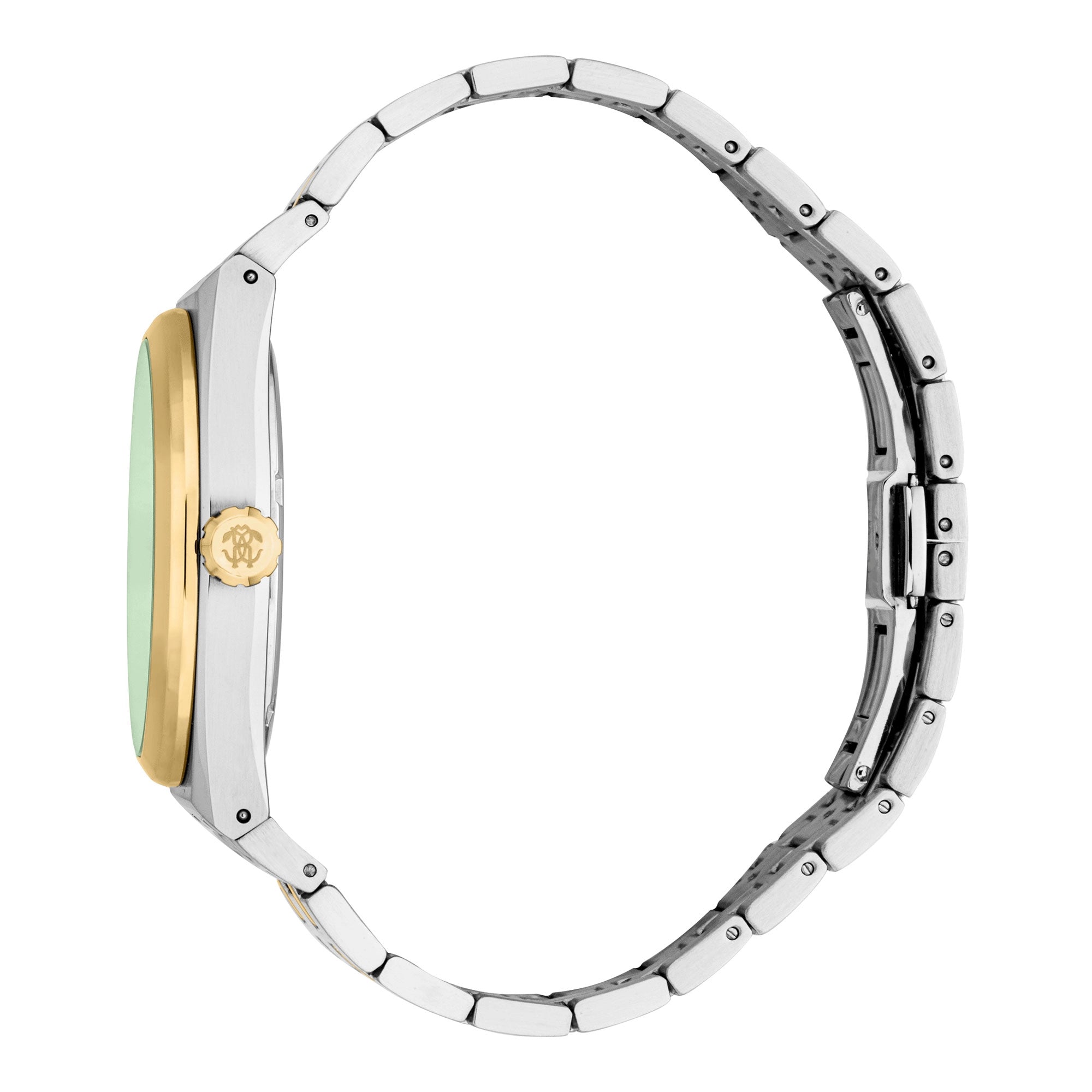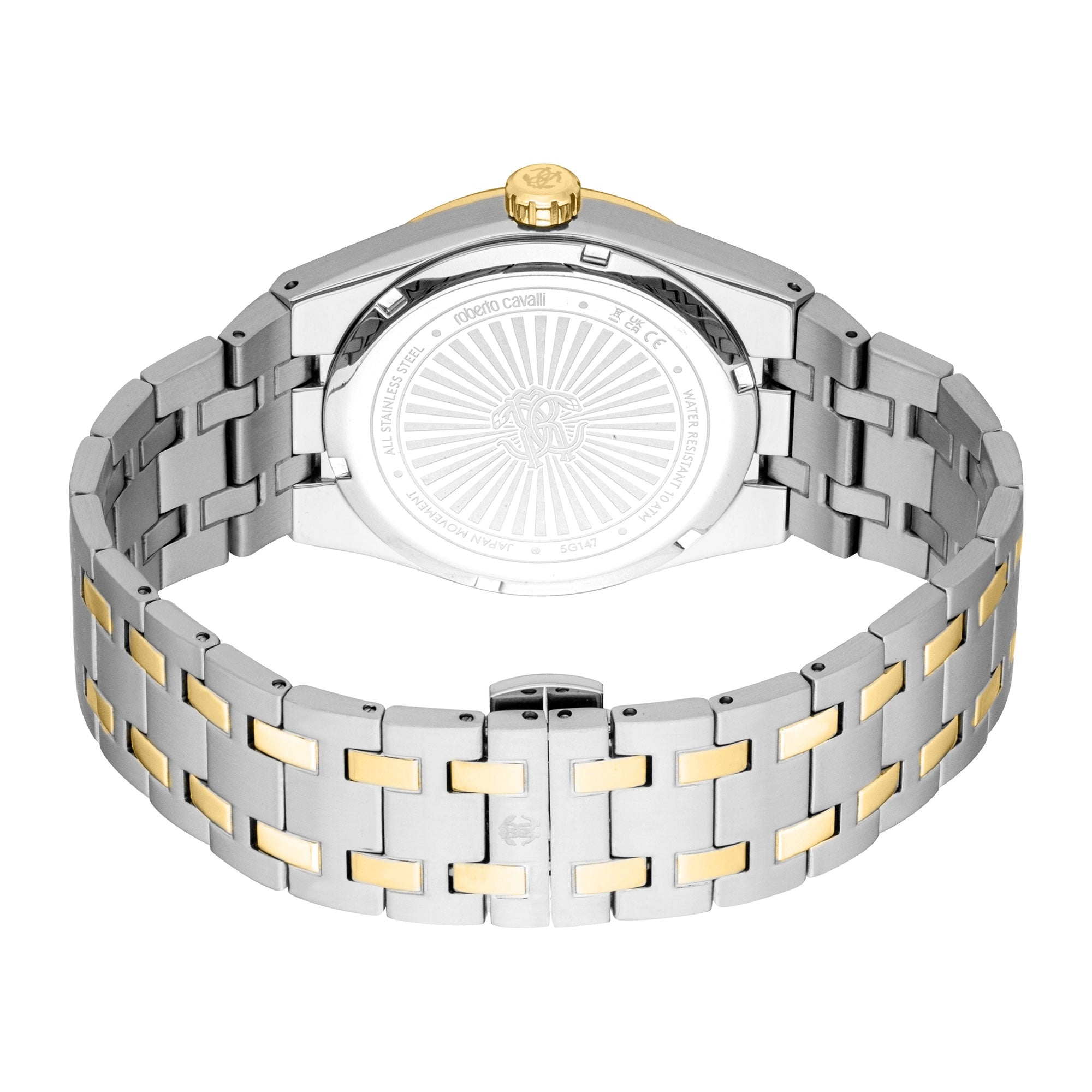 The matching stainless steel band, echoing the silver grey and yellow gold two-tone aesthetic, secures with a secure folding deployant clasp with a push-button, providing both style and comfort. Whether for business or leisure, this Roberto Cavalli watch adds a touch of fashion-forward flair to any ensemble.