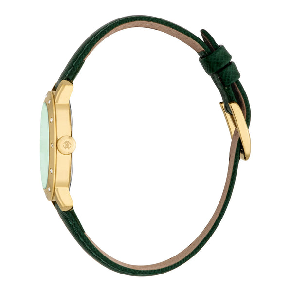 In der Welt der Mode, wo Eleganz auf Kühnheit trifft, entsteht eine Uhr, die das Wesen von Raffinesse und Stil einfängt. Gefertigt im Herzen der Schweizer Uhrmacherkunst, ist diese Roberto Cavalli Lady Uhr ein Zeugnis für verfeinertes Design und exquisite Handwerkskunst. Ihr rundes Gehäuse, getaucht in den opulenten Glanz von Gelbgold, strahlt eine zeitlose Anziehungskraft aus, die sowohl fesselnd als auch mutig ist. Mit einem Gehäusedurchmesser von 30 mm sitzt sie anmutig am Handgelenk, ein perfekter Begleiter für die moderne Frau, die sowohl Form als auch Funktion schätzt. Das Mineralglas bietet einen klaren Blick auf das Zifferblatt, ein faszinierendes Flaschengrün, das die Tiefen eines ruhigen Waldes widerspiegelt. Dieser Farbton, der im Lederband widergespiegelt wird, schafft eine harmonische Farbkombination, die sowohl auffällig als auch dezent ist. Die Dornschließe sorgt für einen sicheren Sitz, während die Pull & Push-Krone diesem eleganten Stück einen Hauch von Praktikabilität verleiht. Bis zu 50 Meter wasserdicht, ist sie so vielseitig wie schön und bereit, Sie vom Konferenzraum bis zum Abend auszugehen zu begleiten. Angetrieben von einem präzisen Quarzwerk, sorgt das Kaliber GL32 dafür, dass die Zeit immer auf Ihrer Seite ist, mit einer 3-Zeiger-Anzeige, die ebenso zuverlässig wie stilvoll ist. Diese Roberto Cavalli Uhr ist mehr als nur ein Zeitmesser, sie ist ein Mode-Statement, eine Feier der Weiblichkeit und ein Spiegelbild des kühnen Geistes, der die Marke Roberto Cavalli definiert.