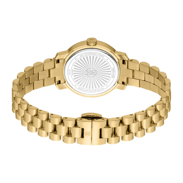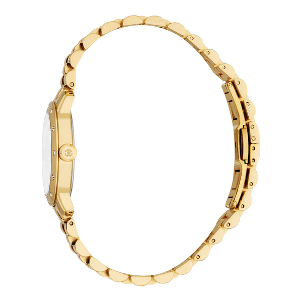 In der Welt der Mode, in der Eleganz auf Innovation trifft, entsteht eine Uhr, die das Wesen von Raffinesse und Stil einfängt. Gefertigt im Herzen der Schweizer Uhrmacherkunst, ist diese Roberto Cavalli Lady Uhr ein Zeugnis für verfeinertes Design und zeitlose Anziehungskraft. Ihr rundes Gehäuse, getaucht in den opulenten Glanz von Gelbgold, misst zarte 30 mm und ergänzt perfekt das anmutige Handgelenk der modernen Frau. Das Mineralglas enthüllt ein silbergraues Zifferblatt, eine Leinwand zurückhaltenden Luxus, auf der drei Zeiger präzise tanzen, angetrieben vom zuverlässigen GL32 Quarzwerk. Das Edelstahlarmband, ebenfalls in Gelbgold, schmiegt sich mit einem Gefühl von Kontinuität und Eleganz um das Handgelenk und wird durch eine Butterfly-Faltschließe mit Druckknopf für Komfort und Leichtigkeit gesichert. Mit einer Wasserdichtigkeit von bis zu 50 Metern ist diese Uhr nicht nur ein Mode-Statement, sondern ein vielseitiger Begleiter für die Abenteuer des Lebens. Die Pull & Push-Krone verleiht einen Hauch klassischen Charmes und lädt die Trägerin ein, die Zeit auf persönliche und intime Weise zu erleben. Diese Roberto Cavalli Uhr ist mehr als ein Accessoire, sie ist eine Feier der Weiblichkeit und Mode, ein Stück, das das Herz derjenigen anspricht, die ihren einzigartigen Stil mit Selbstvertrauen und Anmut zu leben wagen.
